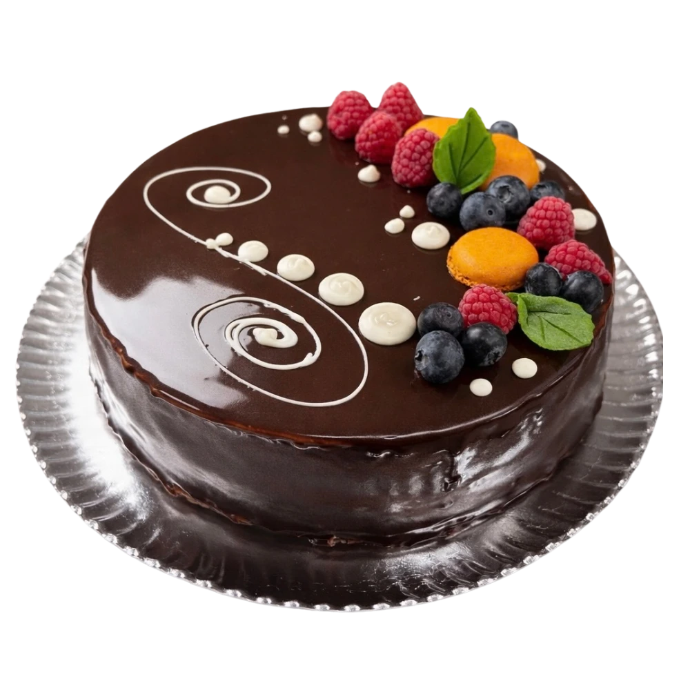 Bizcocho, trufa, nata montada y macarons