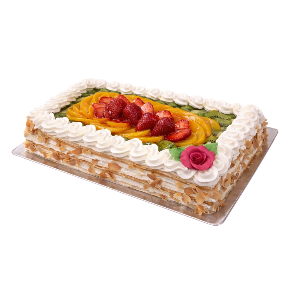 Hojaldre, crema pastelera, nata montada y frutas naturales
